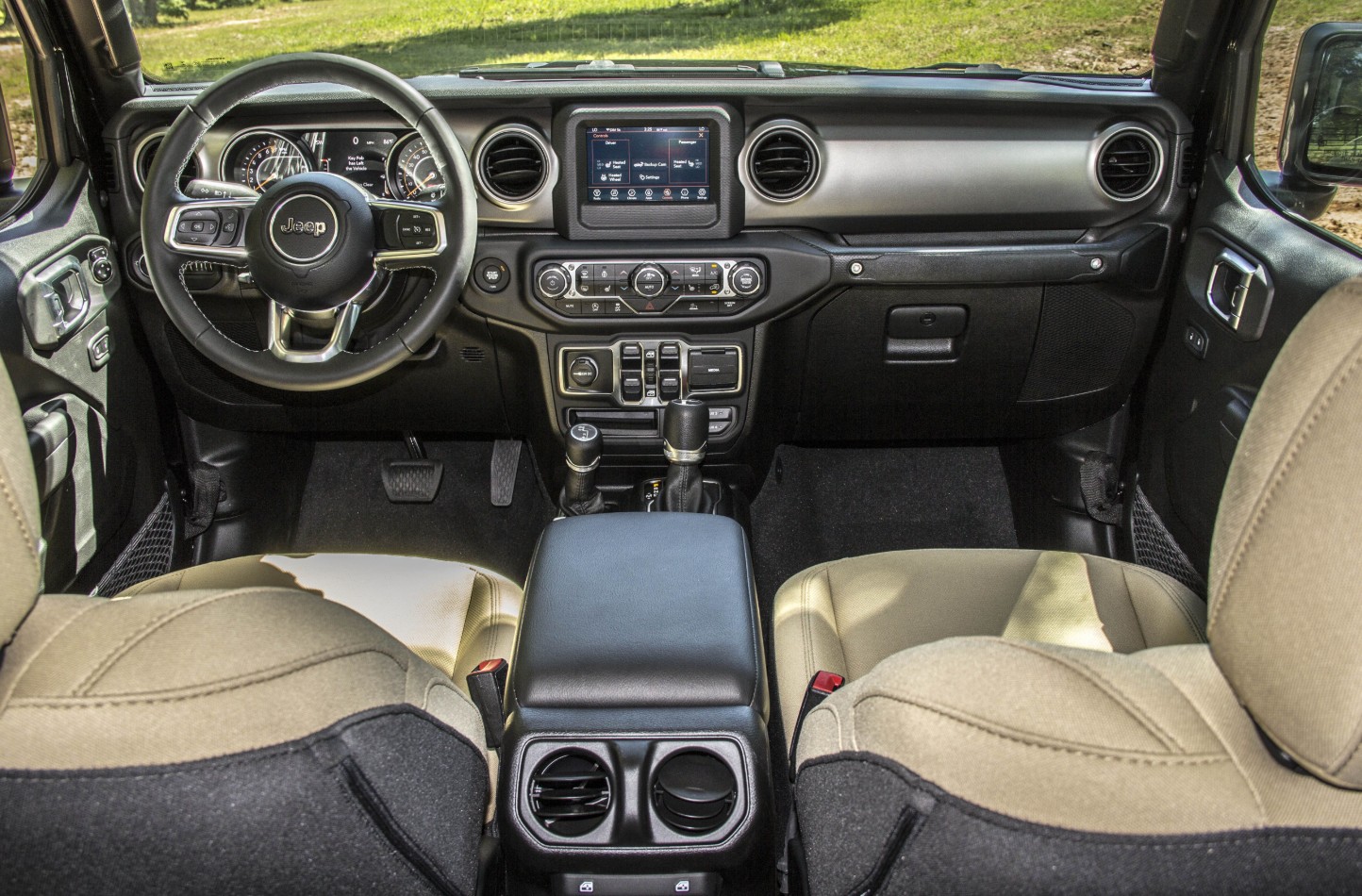 The bed design receives practical upgrades as well, with reinforced tie-down points, an integrated power outlet, and an available spray-in bedliner for durability. A multi-position tailgate now allows more flexibility for hauling, and the optional power tonneau cover adds convenience for everyday use. The Gladiator’s rugged capability is visually expressed through its squared-off fenders, exposed hinges, and removable roof panels—hallmarks of Jeep’s open-air freedom philosophy. Available all-terrain tires up to 35 inches complement the redesigned alloy wheels, reinforcing its stance as the ultimate adventure-ready pickup.